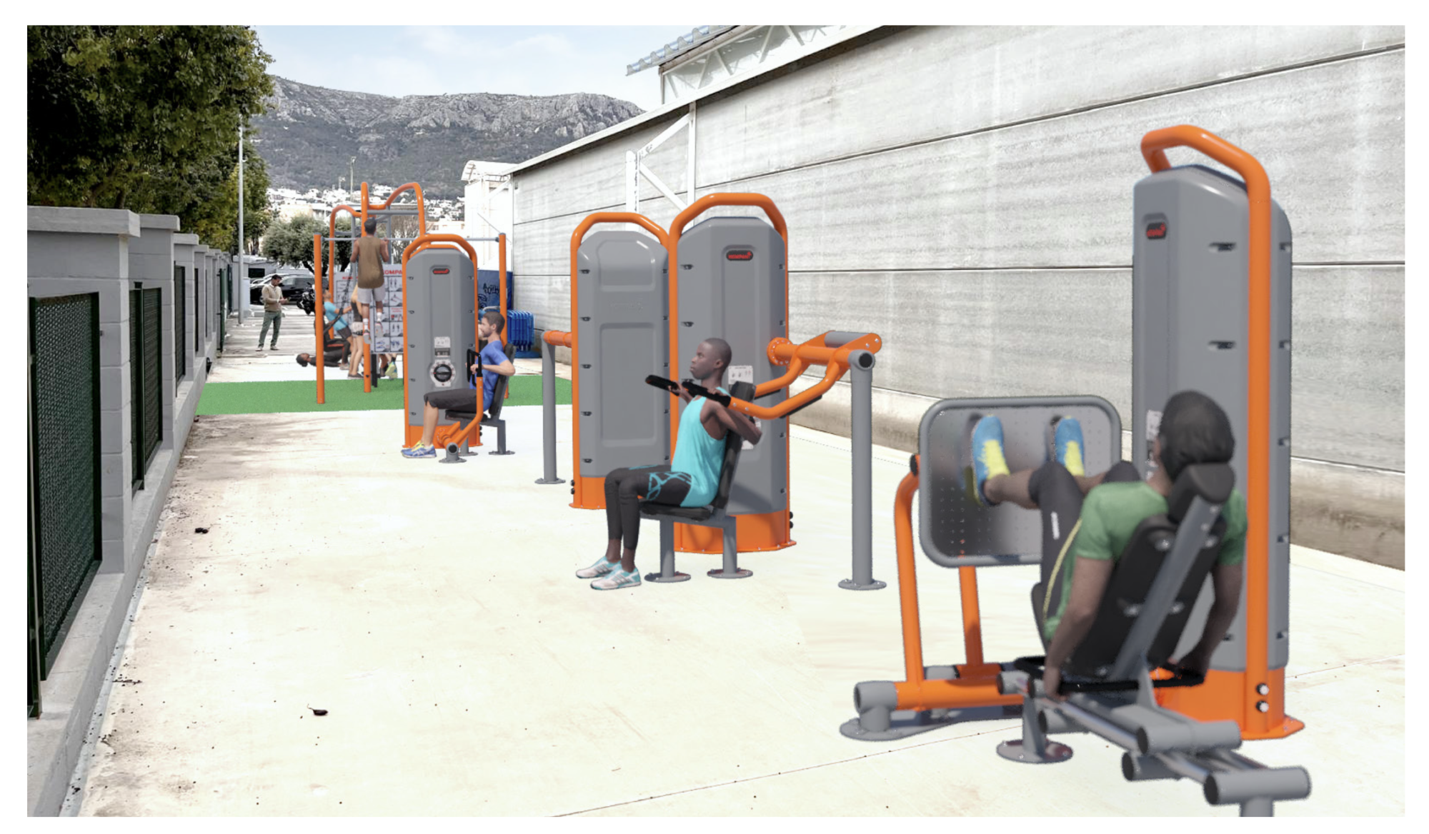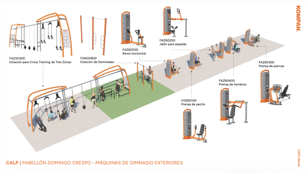 El nuevo espacio deportivo, concebido para el entrenamiento al aire libre de personas de diferentes edades y capacidades físicas, estará equipado con máquinas profesionales de musculación con peso ajustable: prensa de pecho, jalón para espalda, prensa de piernas, prensa de hombros, remo horizontal, estación de cross training de tres zonas y estación de dominadas, entre otros elementos. Todo el equipamiento está diseñado y certificado para su instalación en exterior, con carcasas protectoras que cubren las partes móviles y sistemas de seguridad que evitan atrapamientos y actos vandálicos.